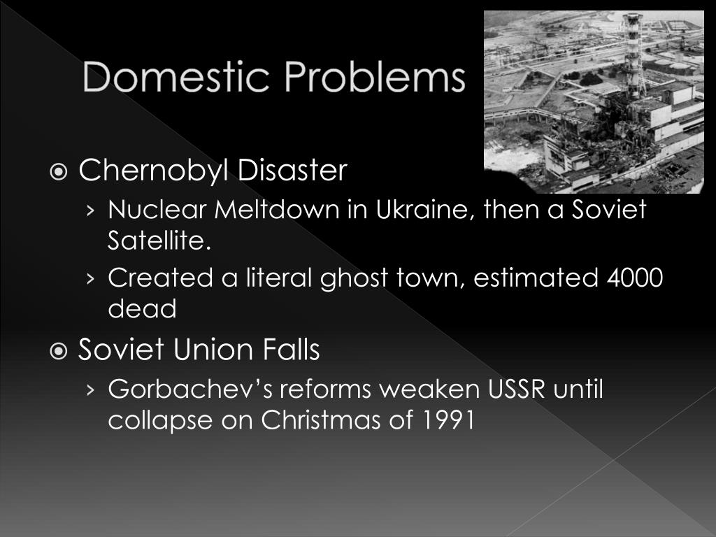 Domestic Problems • Chernobyl Disaster • Nuclear Meltdown in Ukraine, then a Soviet Satellite. • Created a literal ghost town, estimated 4000 dead • Soviet Union Falls • Gorbachev’s reforms weaken USSR until collapse on Christmas of 1991