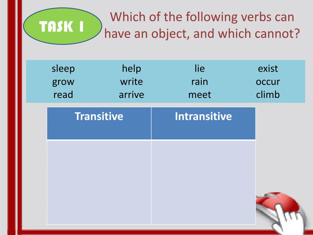 TASK 1 Which of the following verbs can have an object, and which cannot? sleep grow read help write arrive lie rain meet exist occur climb