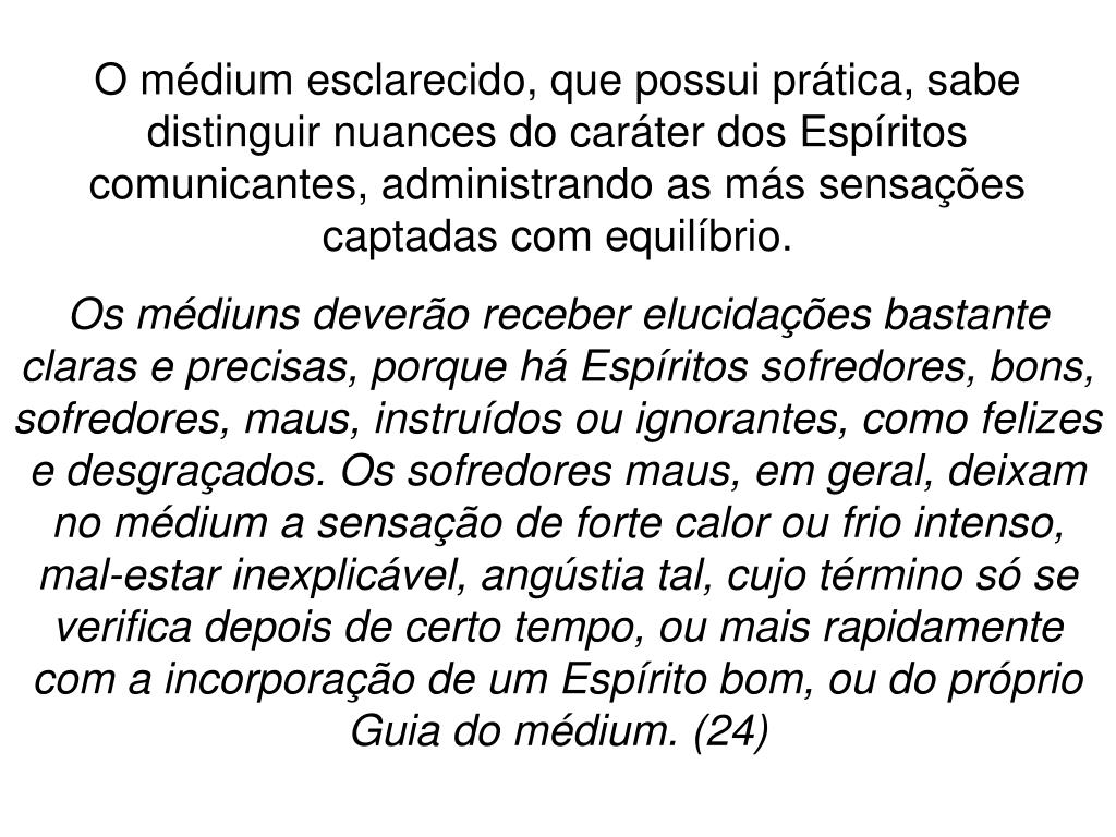 O médium esclarecido, que possui prática, sabe distinguir nuances do caráter dos Espíritos comunicantes, administrando as más sensações captadas com equilíbrio. Os médiuns deverão receber elucidações bastante claras e precisas, porque há Espíritos sofredores, bons, sofredores, maus, instruídos ou ignorantes, como felizes e desgraçados. Os sofredores maus, em geral, deixam no médium a sensação de forte calor ou frio intenso, mal-estar inexplicável, angústia tal, cujo término só se verifica depois de certo tempo, ou mais rapidamente com a incorporação de um Espírito bom, ou do próprio Guia do médium. (24)