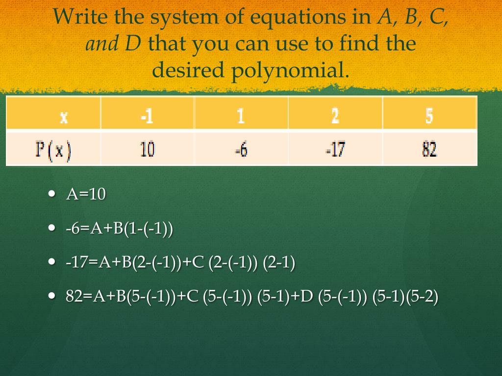 Write the system of equations in A, B, C, andD that you can use to find the desired polynomial. • A=10 • -6=A+B(1-(-1)) • -17=A+B(2-(-1))+C (2-(-1)) (2-1) • 82=A+B(5-(-1))+C (5-(-1)) (5-1)+D (5-(-1)) (5-1)(5-2)