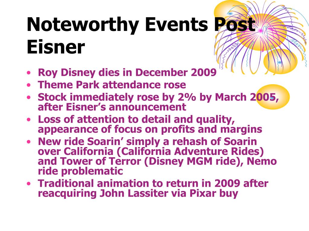 Noteworthy Events Post Eisner • Roy Disney dies in December 2009 • Theme Park attendance rose • Stock immediately rose by 2% by March 2005, after Eisner’s announcement • Loss of attention to detail and quality, appearance of focus on profits and margins • New ride Soarin’ simply a rehash of Soarin over California (California Adventure Rides) and Tower of Terror (Disney MGM ride), Nemo ride problematic • Traditional animation to return in 2009 after reacquiring John Lassiter via Pixar buy