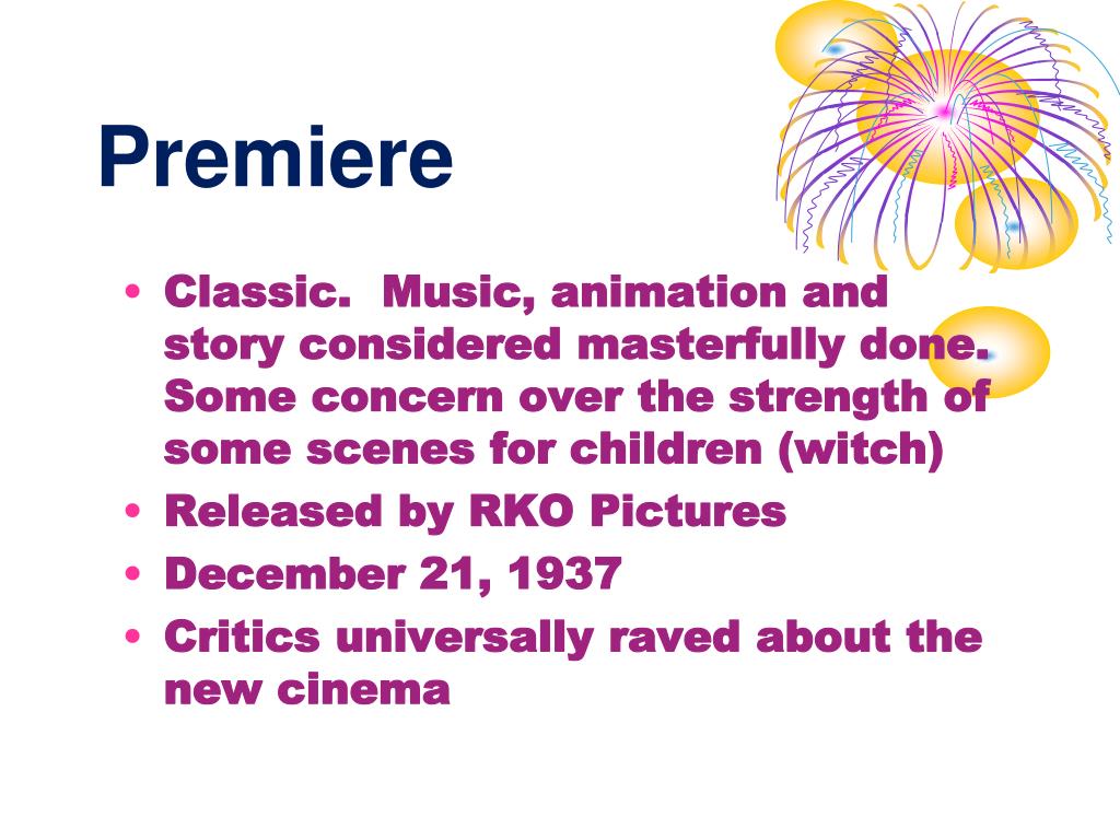 Premiere • Classic. Music, animation and story considered masterfully done. Some concern over the strength of some scenes for children (witch) • Released by RKO Pictures • December 21, 1937 • Critics universally raved about the new cinema