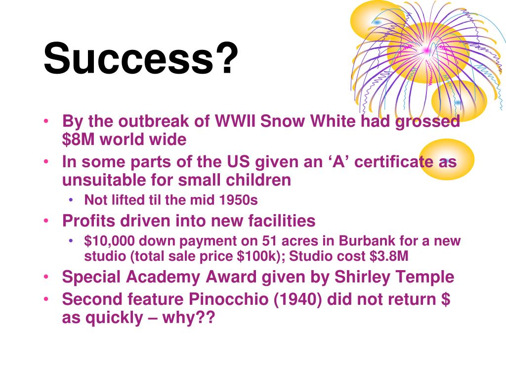 Success? • By the outbreak of WWII Snow White had grossed $8M world wide • In some parts of the US given an ‘A’ certificate as unsuitable for small children • Not lifted til the mid 1950s • Profits driven into new facilities • $10,000 down payment on 51 acres in Burbank for a new studio (total sale price $100k); Studio cost $3.8M • Special Academy Award given by Shirley Temple • Second feature Pinocchio (1940) did not return $ as quickly – why??