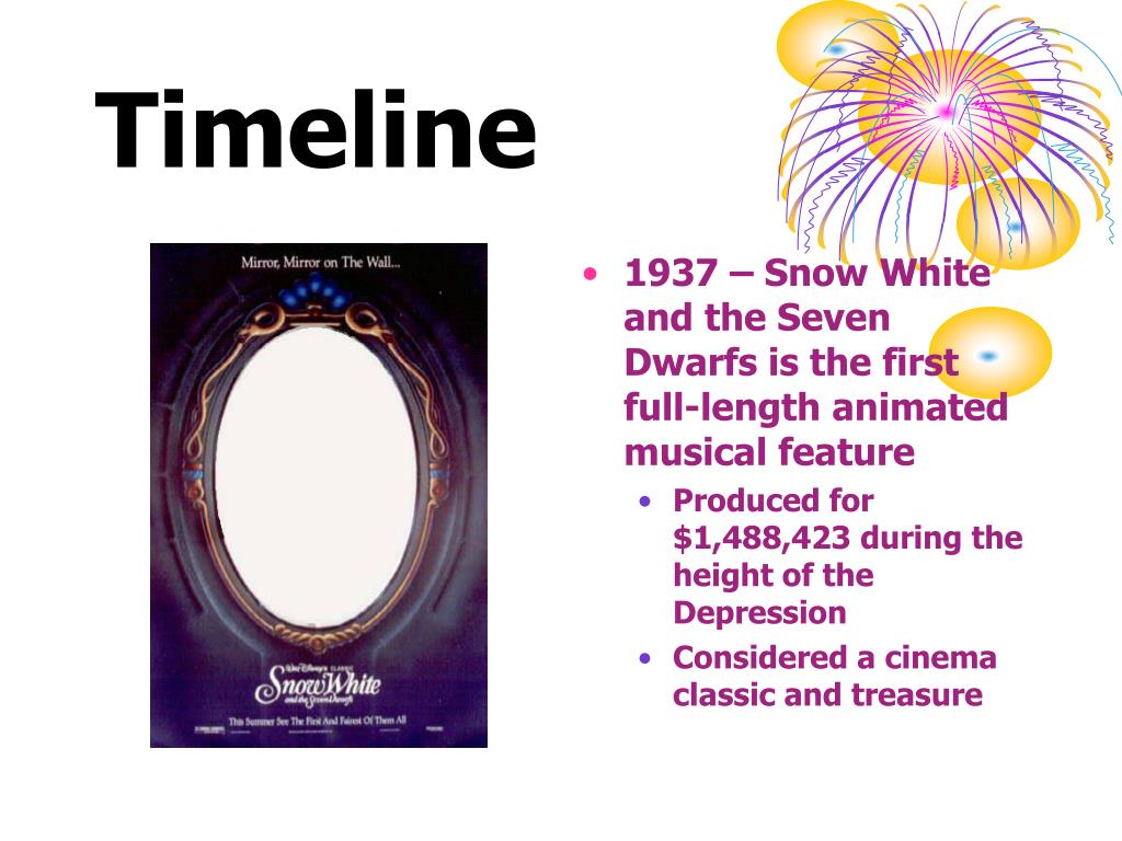 Timeline • 1937 – Snow White and the Seven Dwarfs is the first full-length animated musical feature • Produced for $1,488,423 during the height of the Depression • Considered a cinema classic and treasure