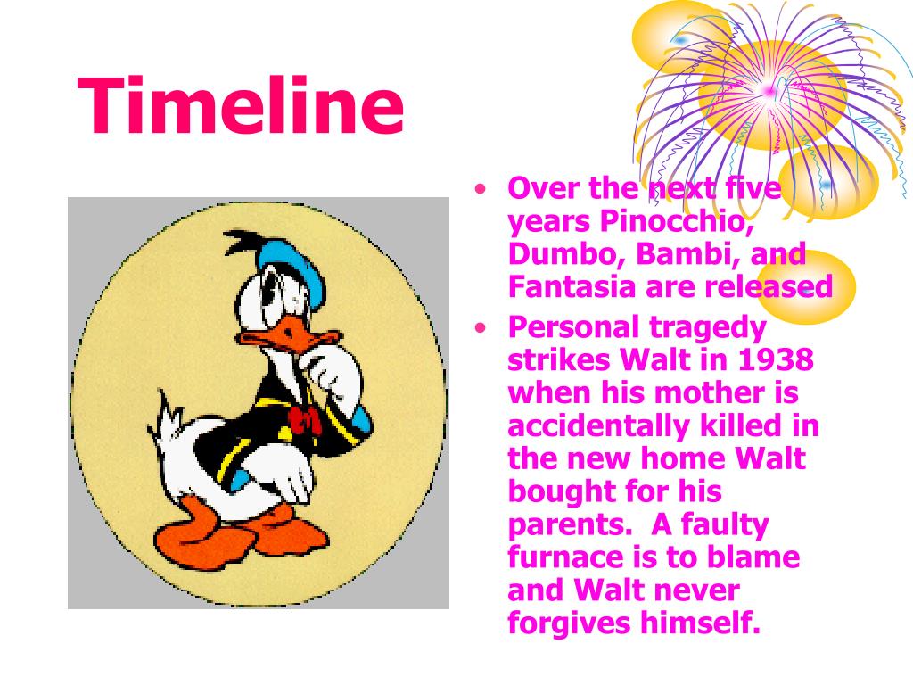 Timeline • Over the next five years Pinocchio, Dumbo, Bambi, and Fantasia are released • Personal tragedy strikes Walt in 1938 when his mother is accidentally killed in the new home Walt bought for his parents. A faulty furnace is to blame and Walt never forgives himself.