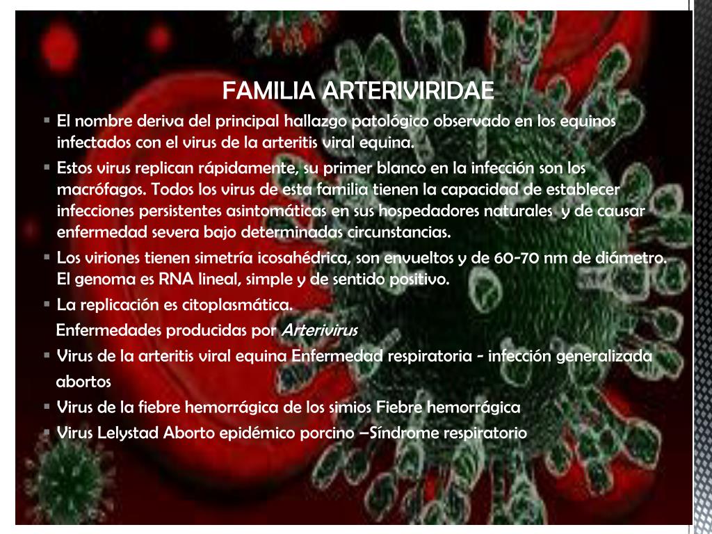 FAMILIA ARTERIVIRIDAE • El nombre deriva del principal hallazgo patológico observado en los equinos infectados con el virus de la arteritis viral equina. • Estos virus replican rápidamente, su primer blanco en la infección son los macrófagos. Todos los virus de esta familia tienen la capacidad de establecer infecciones persistentes asintomáticas en sus hospedadores naturales y de causar enfermedad severa bajo determinadas circunstancias. • Los viriones tienen simetría icosahédrica, son envueltos y de 60-70 nm de diámetro. El genoma es RNA lineal, simple y de sentido positivo. • La replicación es citoplasmática. Enfermedades producidas por Arterivirus • Virus de la arteritis viral equina Enfermedad respiratoria - infección generalizada abortos • Virus de la fiebre hemorrágica de los simios Fiebre hemorrágica • Virus Lelystad Aborto epidémico porcino –Síndrome respiratorio