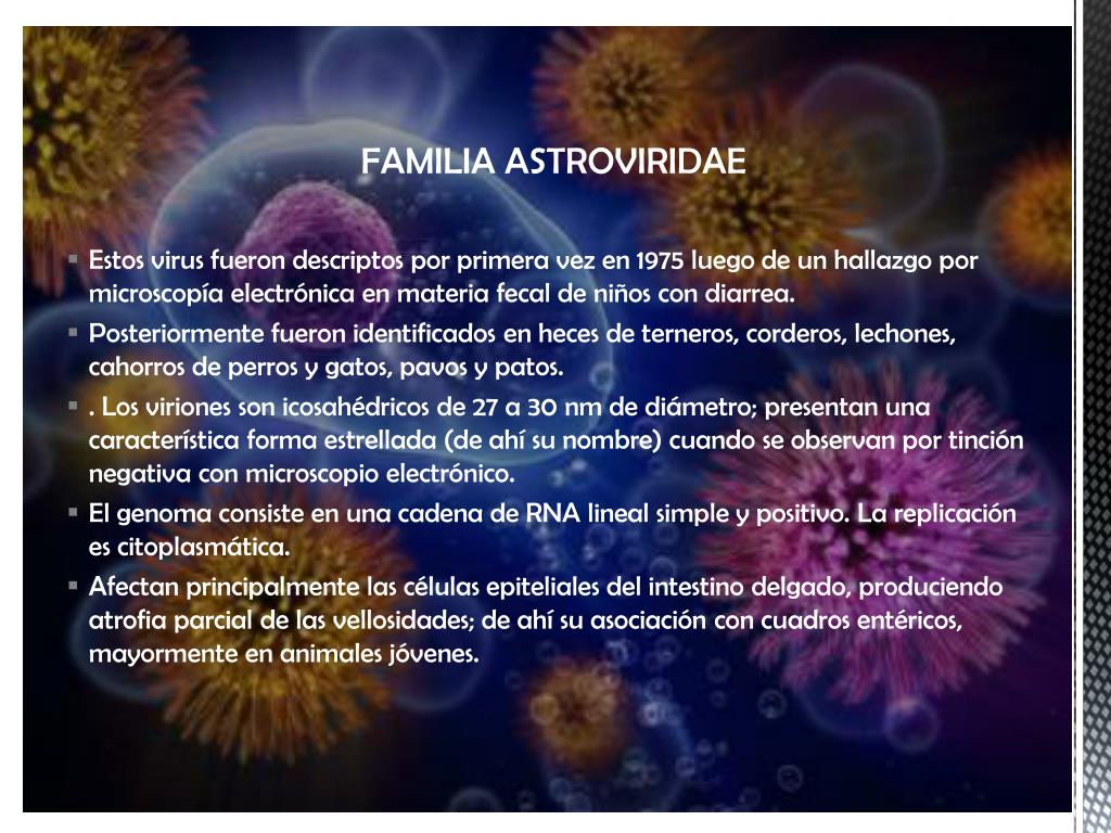 FAMILIA ASTROVIRIDAE • Estos virus fueron descriptos por primera vez en 1975 luego de un hallazgo por microscopía electrónica en materia fecal de niños con diarrea. • Posteriormente fueron identificados en heces de terneros, corderos, lechones, cahorros de perros y gatos, pavos y patos. • . Los viriones son icosahédricos de 27 a 30 nm de diámetro; presentan una característica forma estrellada (de ahí su nombre) cuando se observan por tinción negativa con microscopio electrónico. • El genoma consiste en una cadena de RNA lineal simple y positivo. La replicación es citoplasmática. • Afectan principalmente las células epiteliales del intestino delgado, produciendo atrofia parcial de las vellosidades; de ahí su asociación con cuadros entéricos, mayormente en animales jóvenes.