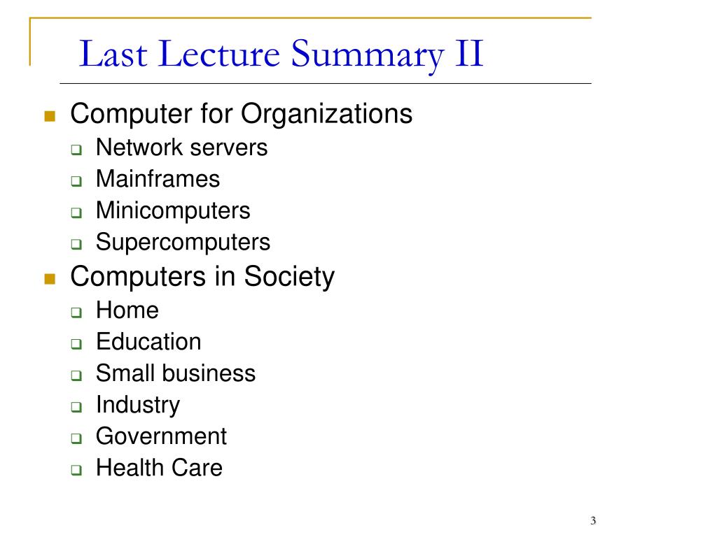 Last Lecture Summary II • Computer for Organizations • Network servers • Mainframes • Minicomputers • Supercomputers • Computers in Society • Home • Education • Small business • Industry • Government • Health Care