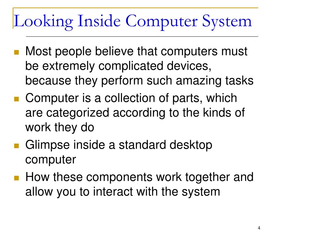 Looking Inside Computer System • Most people believe that computers must be extremely complicated devices, because they perform such amazing tasks • Computer is a collection of parts, which are categorized according to the kinds of work they do • Glimpse inside a standard desktop computer • How these components work together and allow you to interact with the system
