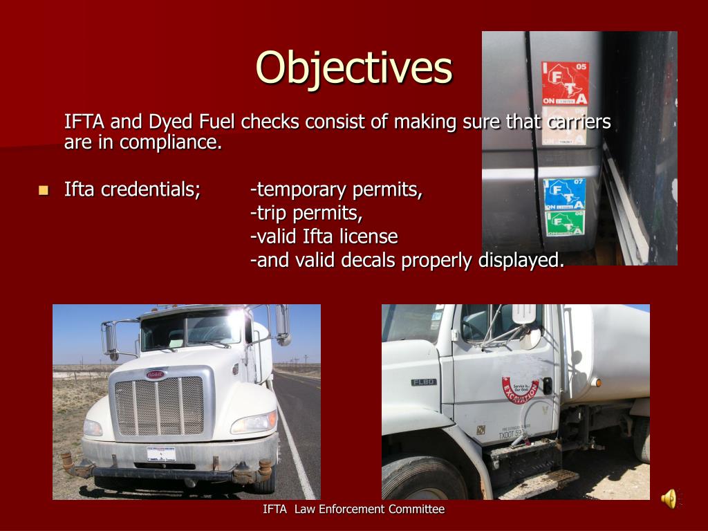 Objectives IFTA and Dyed Fuel checks consist of making sure that carriers are in compliance. • Ifta credentials; -temporary permits, -trip permits, -valid Ifta license -and valid decals properly displayed. IFTA Law Enforcement Committee