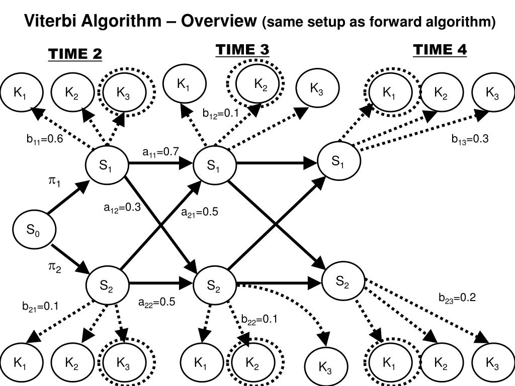 S0 S1 Viterbi Algorithm – Overview (same setup as forward algorithm) TIME 3 TIME 4 TIME 2 K1 K2 K3 K1 K2 K3 K1 K2 K3 b12=0.1 b11=0.6 b13=0.3 a11=0.7 S1 S1 1 a12=0.3 a21=0.5 2 S2 S2 S2 b23=0.2 a22=0.5 b21=0.1 b22=0.1 K1 K2 K3 K1 K2 K1 K2 K3 K3