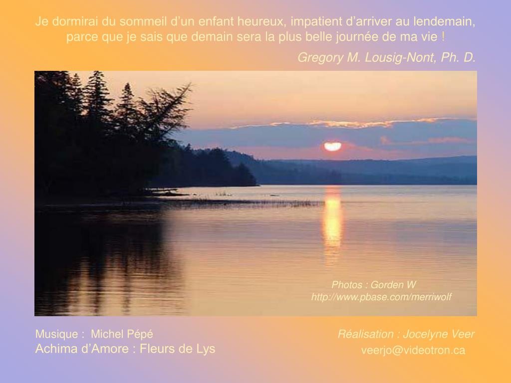 Je dormirai du sommeil d’un enfant heureux, impatient d’arriver au lendemain, parce que je sais que demain sera la plus belle journée de ma vie ! Gregory M. Lousig-Nont, Ph. D. Photos : Gorden W http://www.pbase.com/merriwolf Musique : Michel Pépé Achima d’Amore : Fleurs de Lys Réalisation : Jocelyne Veer veerjo@videotron.ca