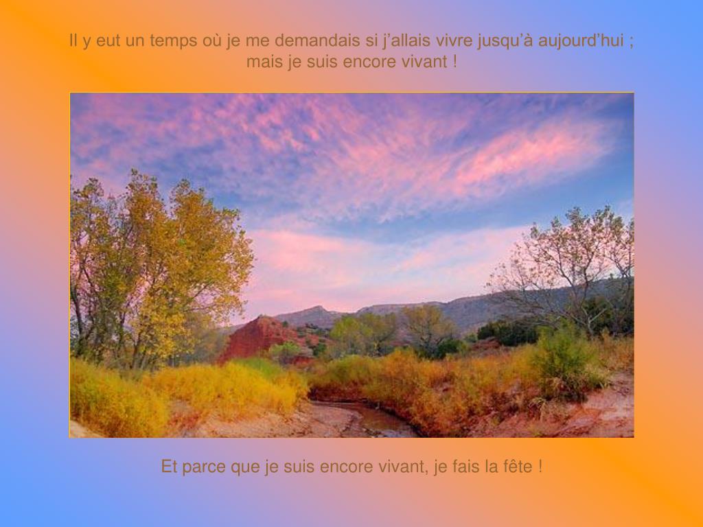 Il y eut un temps où je me demandais si j’allais vivre jusqu’à aujourd’hui ; mais je suis encore vivant ! Et parce que je suis encore vivant, je fais la fête !