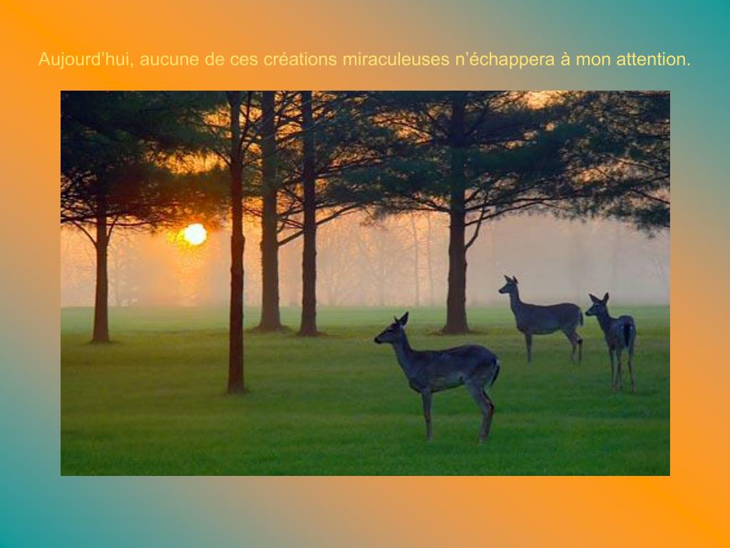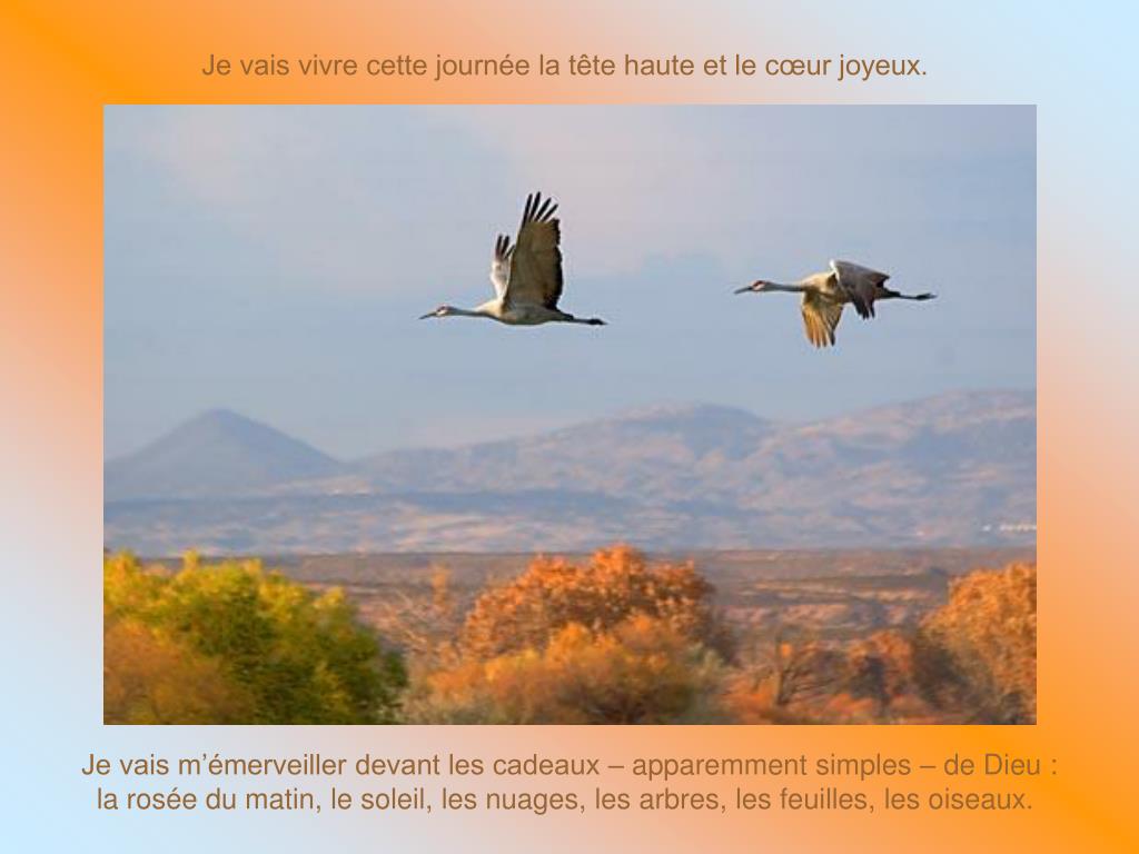 Je vais vivre cette journée la tête haute et le cœur joyeux. Je vais m’émerveiller devant les cadeaux – apparemment simples – de Dieu : la rosée du matin, le soleil, les nuages, les arbres, les feuilles, les oiseaux.