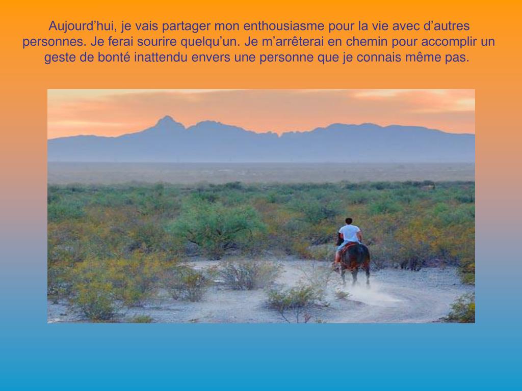 Aujourd’hui, je vais partager mon enthousiasme pour la vie avec d’autres personnes. Je ferai sourire quelqu’un. Je m’arrêterai en chemin pour accomplir un geste de bonté inattendu envers une personne que je connais même pas.