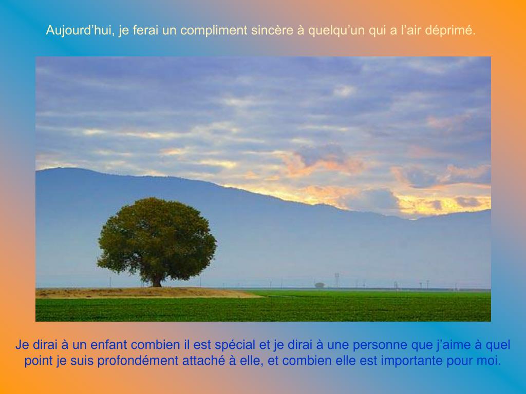 Aujourd’hui, je ferai un compliment sincère à quelqu’un qui a l’air déprimé. Je dirai à un enfant combien il est spécial et je dirai à une personne que j’aime à quel point je suis profondément attaché à elle, et combien elle est importante pour moi.