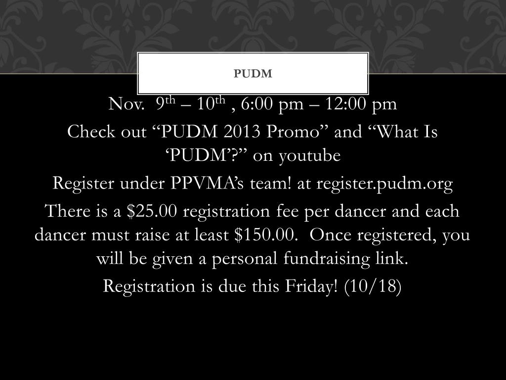 PUDM • Nov. 9th – 10th , 6:00 pm – 12:00 pm • Check out “PUDM 2013 Promo” and “What Is ‘PUDM’?” on youtube • Register under PPVMA’s team! at register.pudm.org • There is a $25.00 registration fee per dancer and each dancer must raise at least $150.00. Once registered, you will be given a personal fundraising link. • Registration is due this Friday! (10/18)