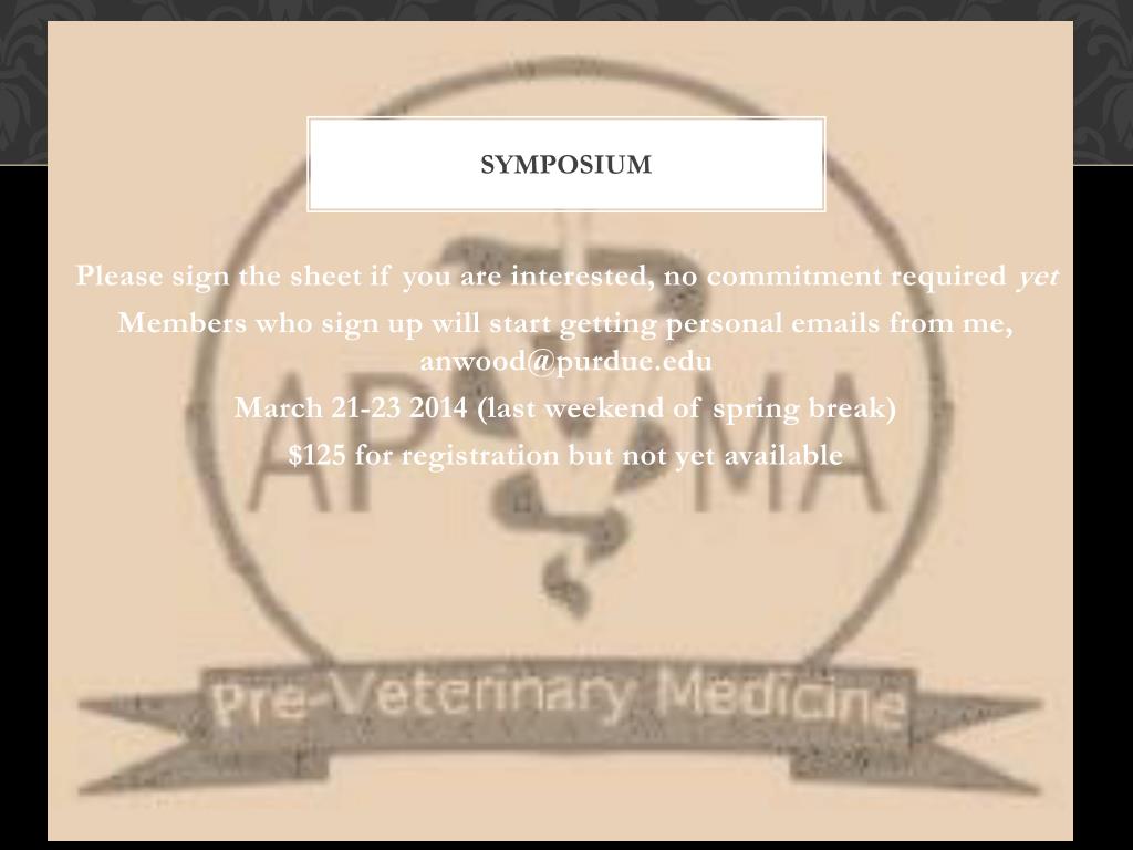 SYMPOSIUM • Please sign the sheet if you are interested, no commitment required yet • Members who sign up will start getting personal emails from me, anwood@purdue.edu • March 21-23 2014 (last weekend of spring break) • $125 for registration but not yet available
