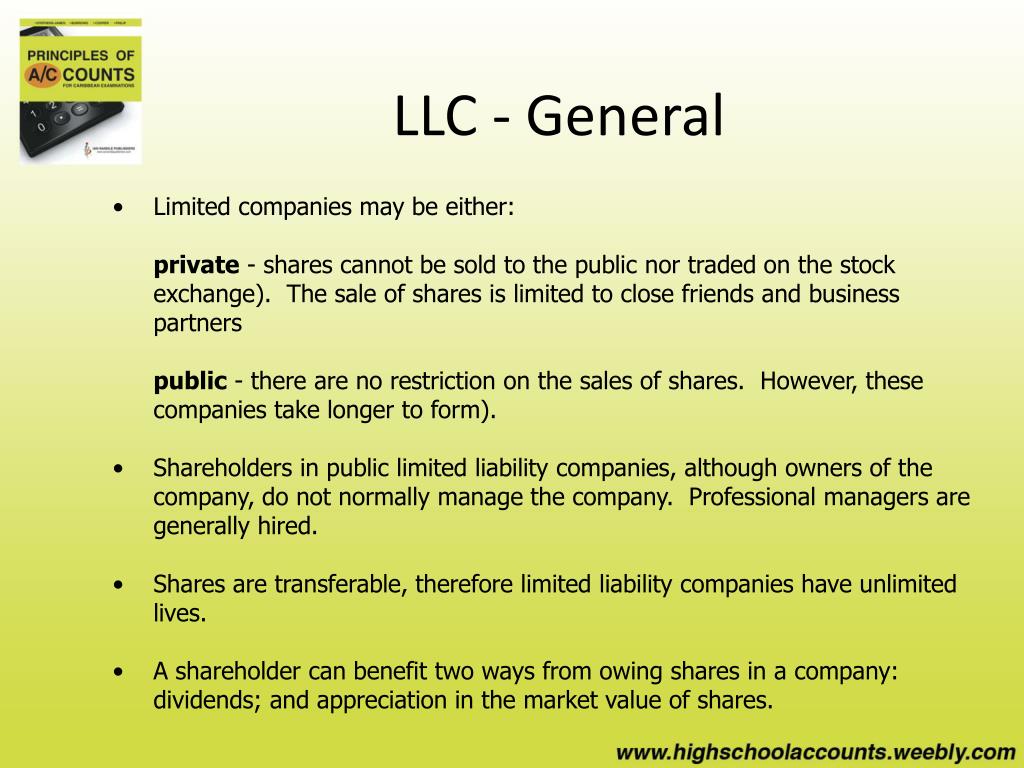 LLC - General • Limited companies may be either: • private - shares cannot be sold to the public nor traded on the stock exchange). The sale of shares is limited to close friends and business partners • public - there are no restriction on the sales of shares. However, these companies take longer to form). • Shareholders in public limited liability companies, although owners of the company, do not normally manage the company. Professional managers are generally hired. • Shares are transferable, therefore limited liability companies have unlimited lives. • A shareholder can benefit two ways from owing shares in a company: dividends; and appreciation in the market value of shares.