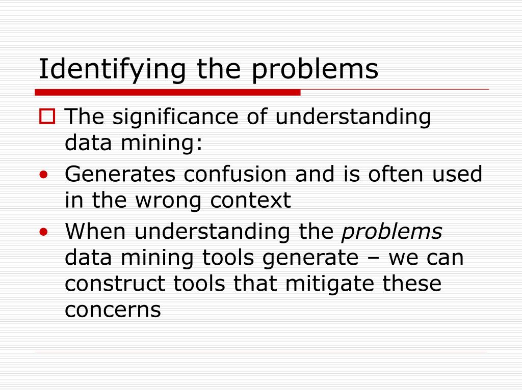 Identifying the problems • The significance of understanding data mining: • Generates confusion and is often used in the wrong context • When understanding the problems data mining tools generate – we can construct tools that mitigate these concerns