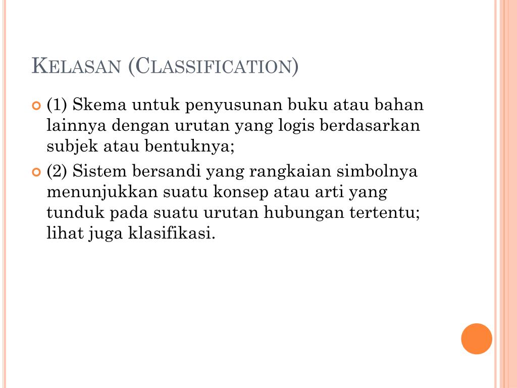 Kelasan (Classification) • (1) Skema untuk penyusunan buku atau bahan lainnya dengan urutan yang logis berdasarkan subjek atau bentuknya; • (2) Sistem bersandi yang rangkaian simbolnya menunjukkan suatu konsep atau arti yang tunduk pada suatu urutan hubungan tertentu; lihat juga klasifikasi.