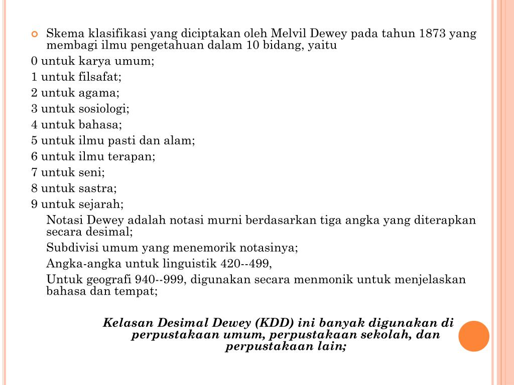 Skema klasifikasi yang diciptakan oleh Melvil Dewey pada tahun 1873 yang membagi ilmu pengetahuan dalam 10 bidang, yaitu 0 untuk karya umum; 1 untuk filsafat; 2 untuk agama; 3 untuk sosiologi; 4 untuk bahasa; 5 untuk ilmu pasti dan alam; 6 untuk ilmu terapan; 7 untuk seni; 8 untuk sastra; 9 untuk sejarah; Notasi Dewey adalah notasi murni berdasarkan tiga angka yang diterapkan secara desimal; Subdivisi umum yang menemorik notasinya; Angka-angka untuk linguistik 420--499, Untuk geografi 940--999, digunakan secara menmonik untuk menjelaskan bahasa dan tempat; Kelasan Desimal Dewey (KDD) ini banyak digunakan di perpustakaan umum, perpustakaan sekolah, dan perpustakaan lain;