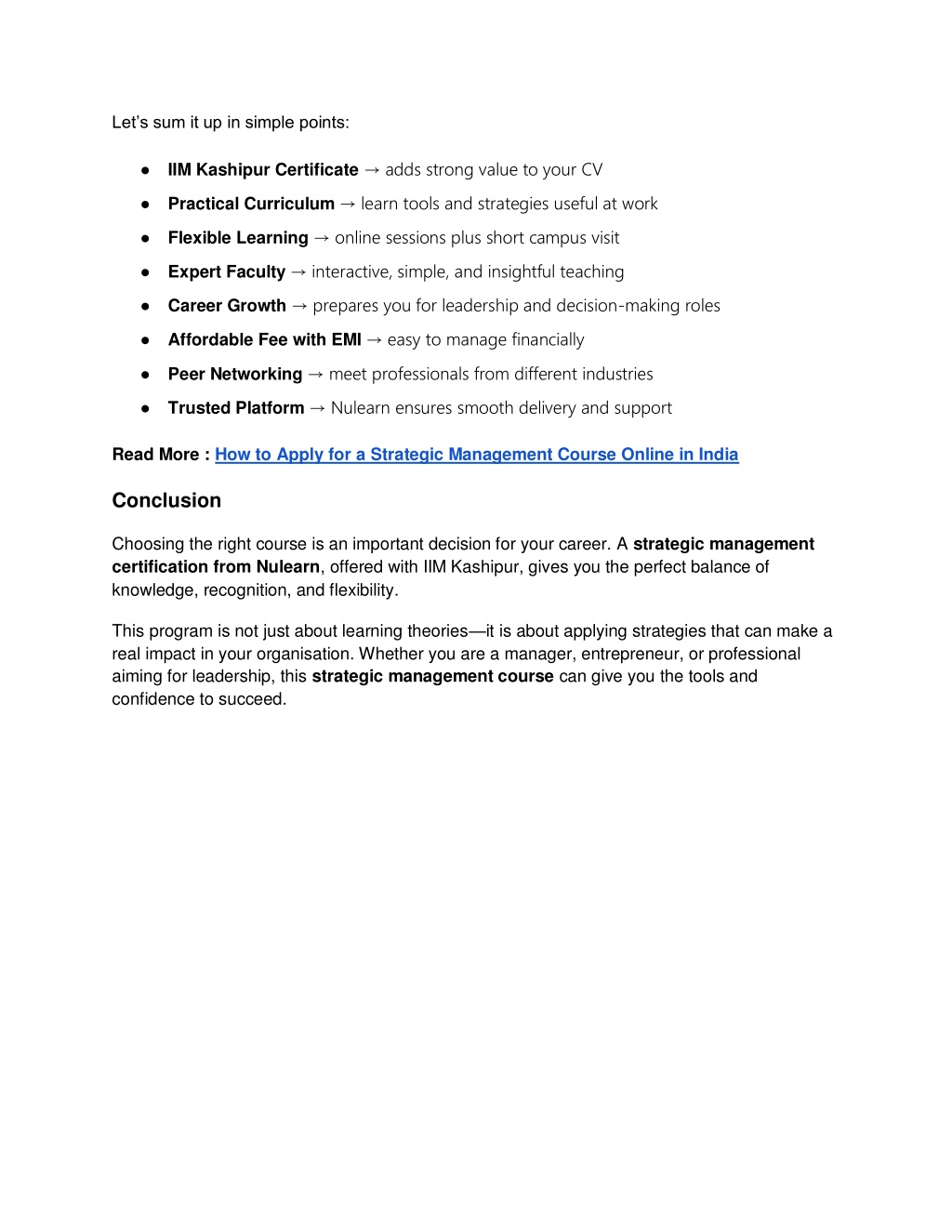 Let’s sum it up in simple points: ●IIM Kashipur Certificate→ adds strong value to your CV ●Practical Curriculum→ learn tools and strategies useful at work ●Flexible Learning→ online sessions plus short campus visit ●Expert Faculty→ interactive, simple, and insightful teaching ●Career Growth→ prepares you for leadership and decision-making roles ●Affordable Fee with EMI→ easy to manage financially ●Peer Networking→ meet professionals from different industries ●Trusted Platform→ Nulearn ensures smooth delivery and support Read More : How to Apply for a Strategic Management Course Online in India Conclusion Choosing the right course is an important decision for your career. A strategic management certification from Nulearn, offered with IIM Kashipur, gives you the perfect balance of knowledge, recognition, and flexibility. This program is not just about learning theories—it is about applying strategies that can make a real impact in your organisation. Whether you are a manager, entrepreneur, or professional aiming for leadership, this strategic management course can give you the tools and confidence to succeed.