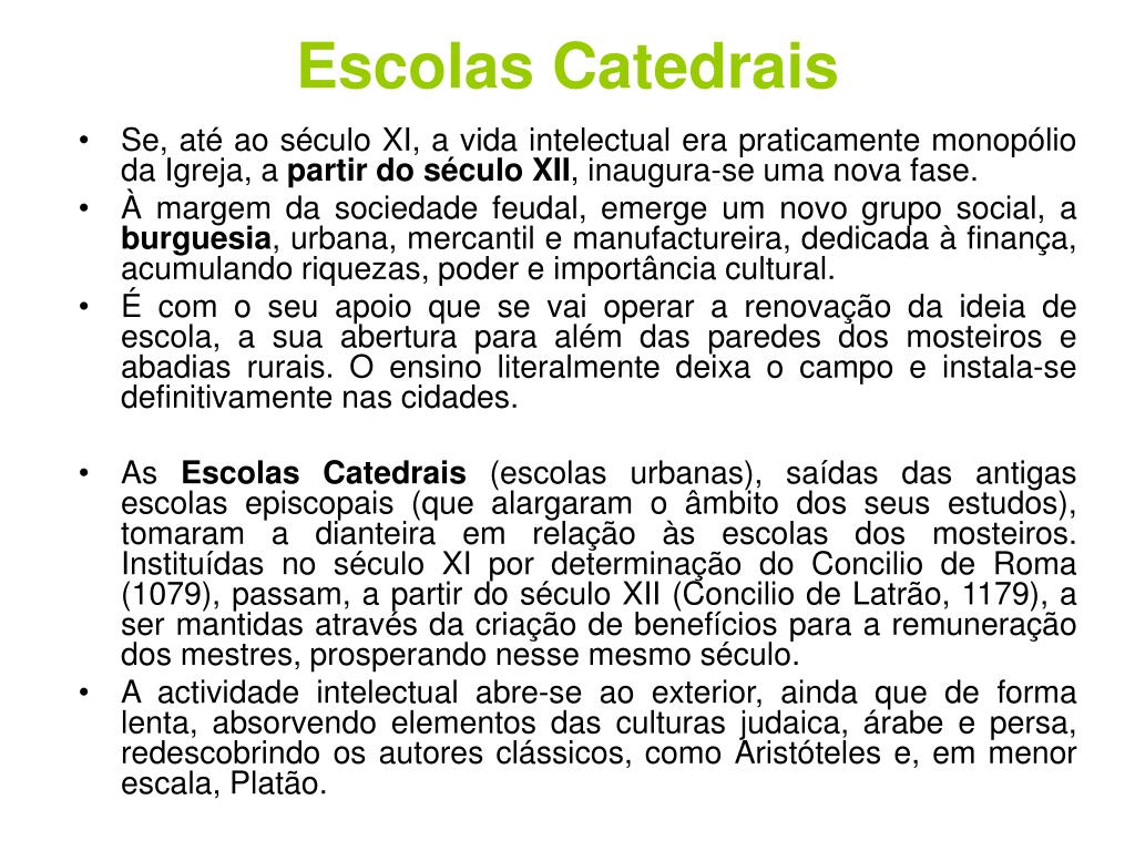 Escolas Catedrais • Se, até ao século XI, a vida intelectual era praticamente monopólio da Igreja, a partir do século XII, inaugura-se uma nova fase. • À margem da sociedade feudal, emerge um novo grupo social, a burguesia, urbana, mercantil e manufactureira, dedicada à finança, acumulando riquezas, poder e importância cultural. • É com o seu apoio que se vai operar a renovação da ideia de escola, a sua abertura para além das paredes dos mosteiros e abadias rurais. O ensino literalmente deixa o campo e instala-se definitivamente nas cidades. • As Escolas Catedrais (escolas urbanas), saídas das antigas escolas episcopais (que alargaram o âmbito dos seus estudos), tomaram a dianteira em relação às escolas dos mosteiros. Instituídas no século XI por determinação do Concilio de Roma (1079), passam, a partir do século XII (Concilio de Latrão, 1179), a ser mantidas através da criação de benefícios para a remuneração dos mestres, prosperando nesse mesmo século. • A actividade intelectual abre-se ao exterior, ainda que de forma lenta, absorvendo elementos das culturas judaica, árabe e persa, redescobrindo os autores clássicos, como Aristóteles e, em menor escala, Platão.