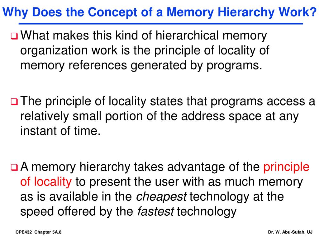 Why Does the Concept of a Memory Hierarchy Work? • What makes this kind of hierarchical memory organization work is the principle of locality of memory references generated by programs. • The principle of locality states that programs access a relatively small portion of the address space at any instant of time. • A memory hierarchy takes advantage of the principle of locality to present the user with as much memory as is available in the cheapesttechnology at the speed offered by the fastesttechnology
