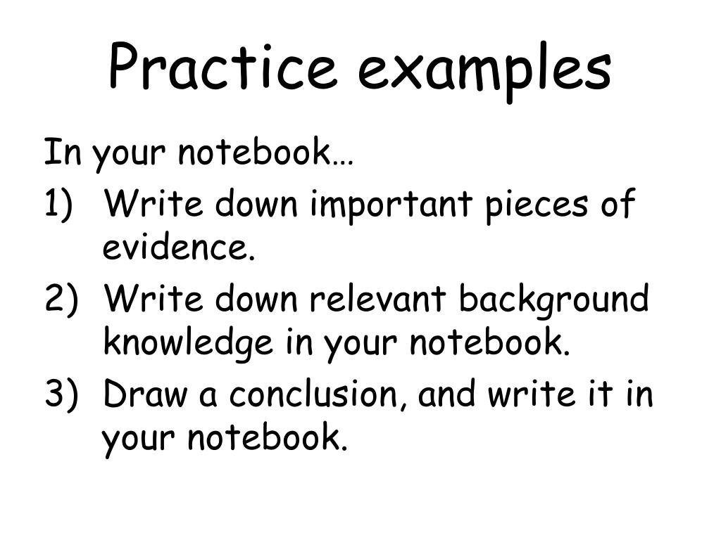 Practice examples In your notebook… • Write down important pieces of evidence. • Write down relevant background knowledge in your notebook. • Draw a conclusion, and write it in your notebook.