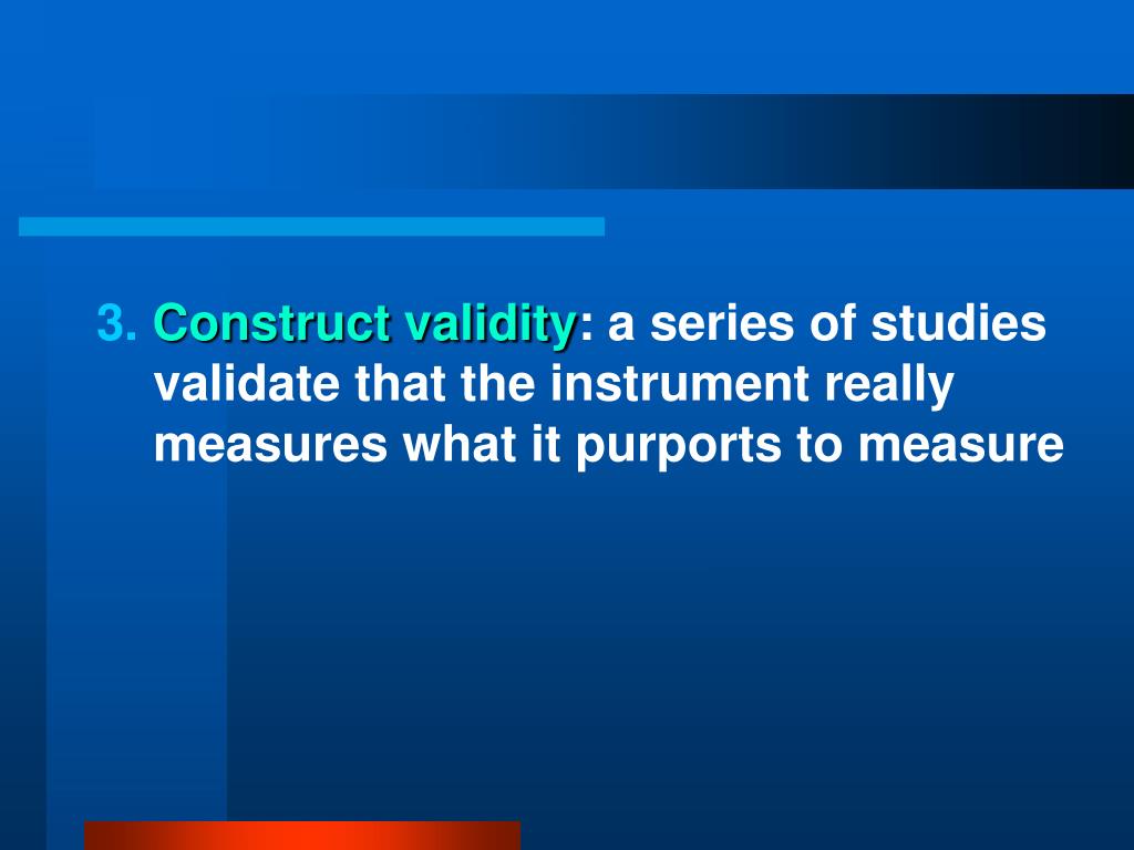3.Construct validity: a series of studies validate that the instrument really measures what it purports to measure