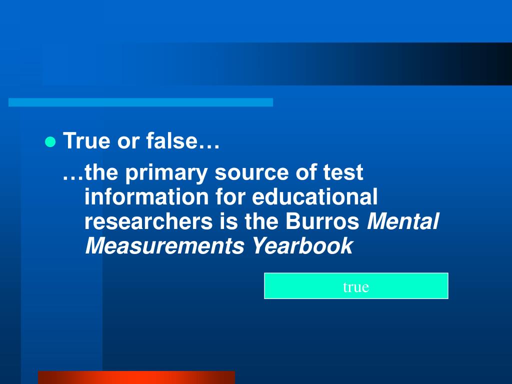 True or false… …the primary source of test information for educational researchers is the Burros Mental Measurements Yearbook true