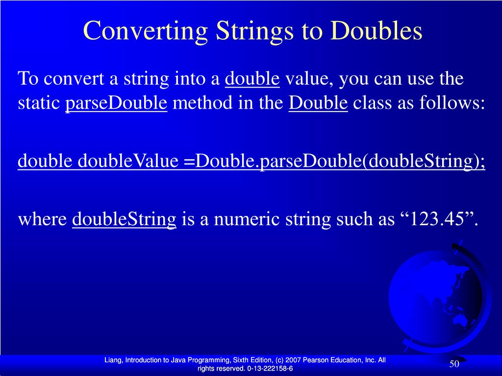 Converting Strings to Doubles To convert a string into a double value, you can use the static parseDouble method in the Double class as follows: double doubleValue =Double.parseDouble(doubleString); where doubleString is a numeric string such as “123.45”.