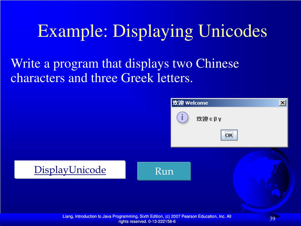 Example: Displaying Unicodes Write a program that displays two Chinese characters and three Greek letters. DisplayUnicode Run