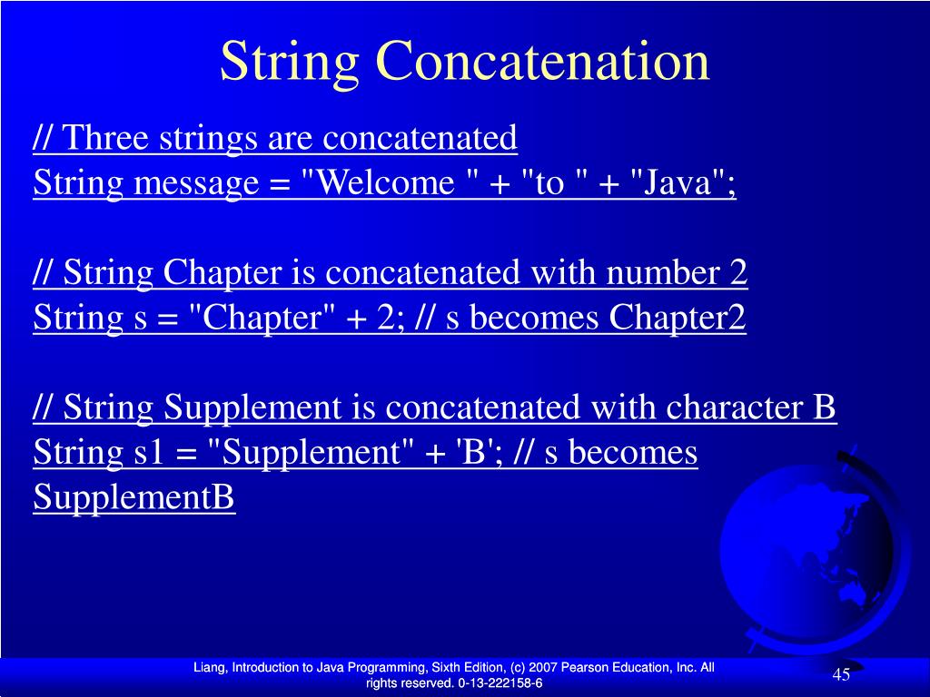 String Concatenation // Three strings are concatenated String message = "Welcome " + "to " + "Java"; // String Chapter is concatenated with number 2 String s = "Chapter" + 2; // s becomes Chapter2 // String Supplement is concatenated with character B String s1 = "Supplement" + 'B'; // s becomes SupplementB