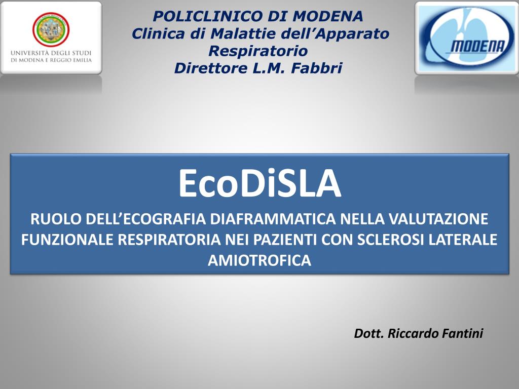 POLICLINICO DI MODENA Clinica di Malattie dell’Apparato Respiratorio Direttore L.M. Fabbri EcoDiSLA RUOLO DELL’ECOGRAFIA DIAFRAMMATICA NELLA VALUTAZIONE FUNZIONALE RESPIRATORIA NEI PAZIENTI CON SCLEROSI LATERALE AMIOTROFICA Dott. Riccardo Fantini