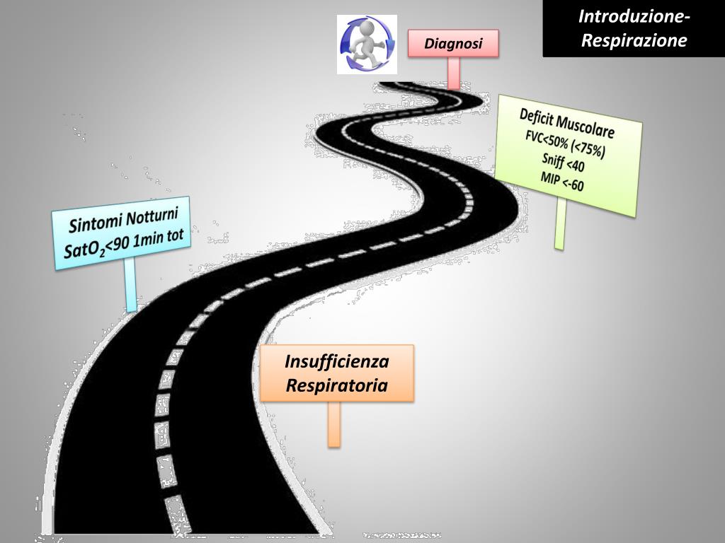 Introduzione-Respirazione Diagnosi Deficit Muscolare FVC<50% (<75%) Sniff <40 MIP <-60 Sintomi Notturni SatO2<90 1min tot Insufficienza Respiratoria