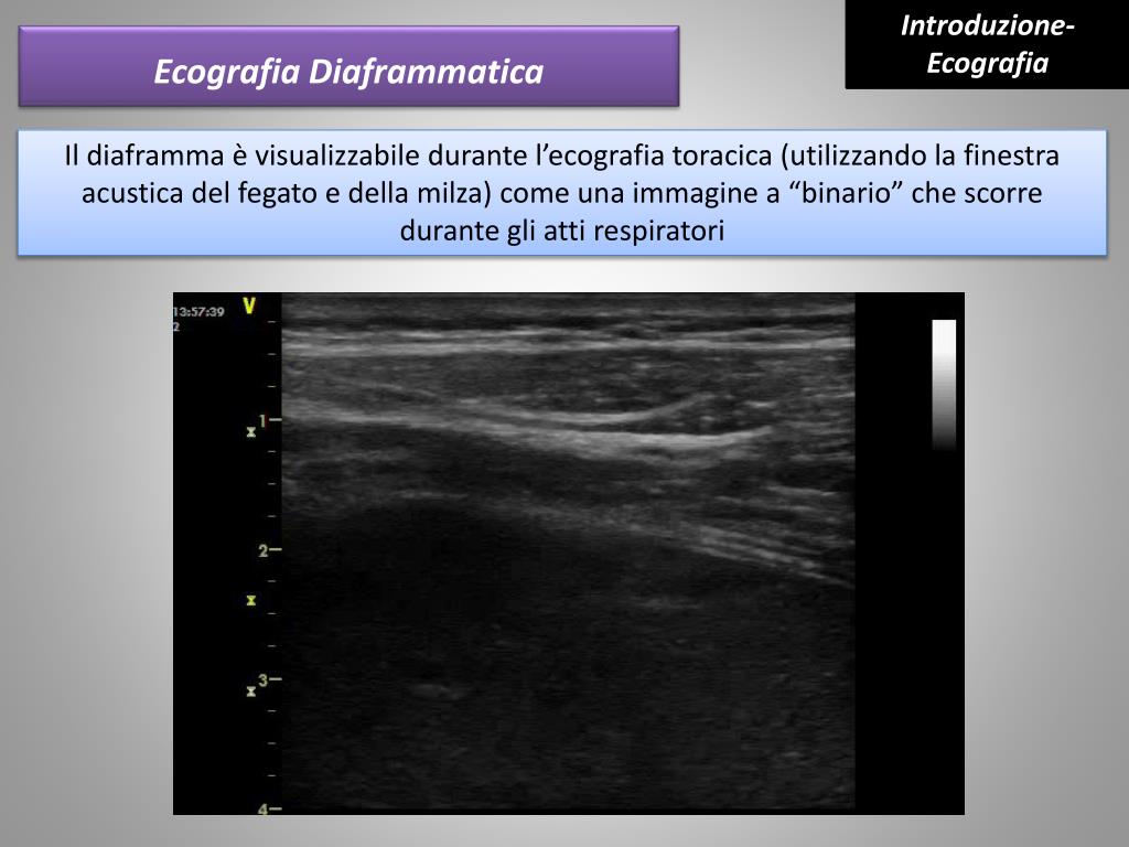 Introduzione-Ecografia Ecografia Diaframmatica Il diaframma è visualizzabile durante l’ecografia toracica (utilizzando la finestra acustica del fegato e della milza) come una immagine a “binario” che scorre durante gli atti respiratori
