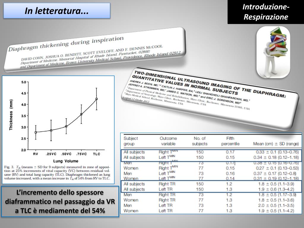 Introduzione-Respirazione In letteratura... L’incremento dello spessore diaframmatico nel passaggio da VR a TLC è mediamente del 54%