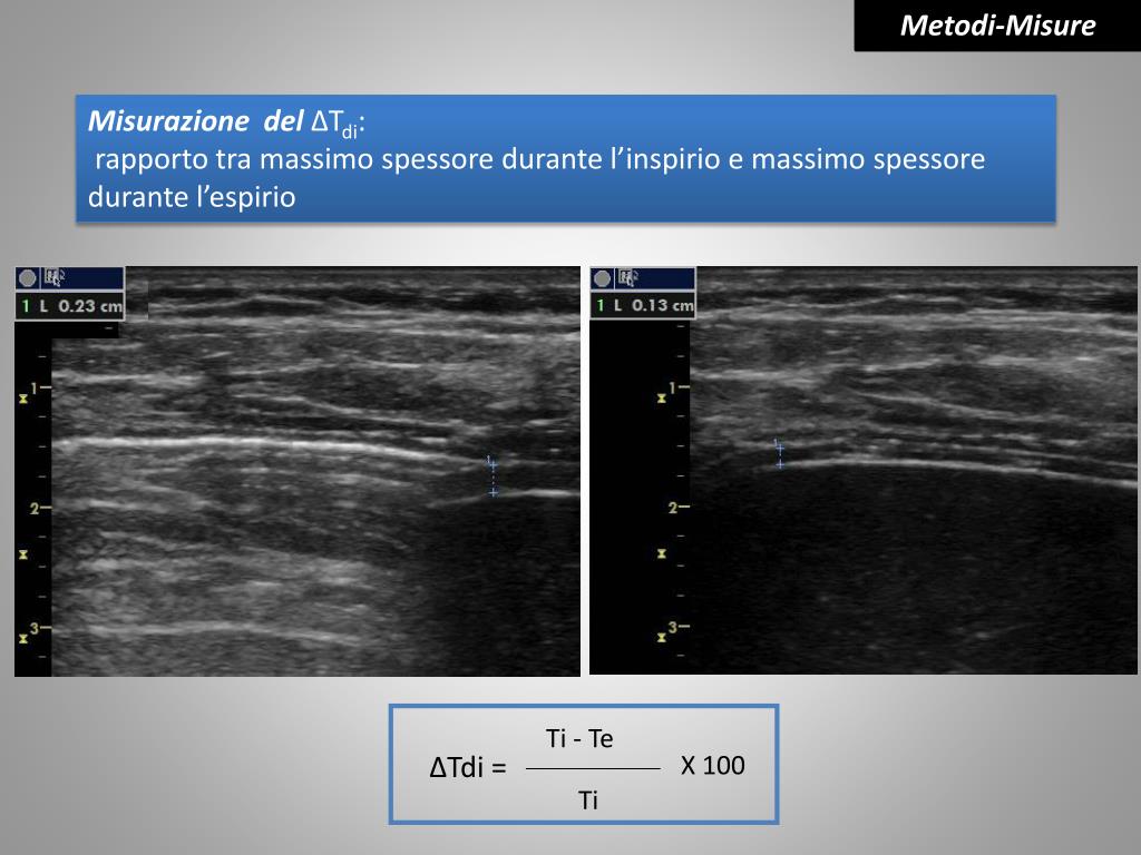 Metodi-Misure Ti - Te ΔTdi = X 100 Ti Misurazione del ΔTdi: rapporto tra massimo spessore durante l’inspirio e massimo spessore durante l’espirio
