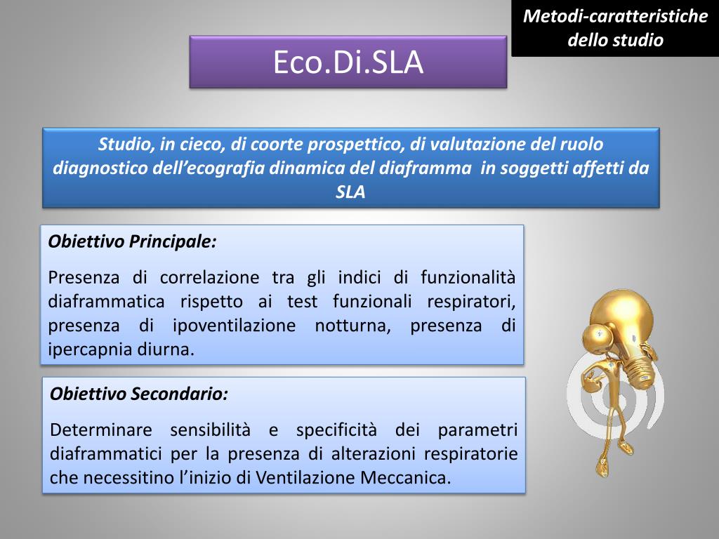 Metodi-caratteristiche dello studio Eco.Di.SLA Studio, in cieco, di coorte prospettico, di valutazione del ruolo diagnostico dell’ecografia dinamica del diaframma in soggetti affetti da SLA Obiettivo Principale: Presenza di correlazione tra gli indici di funzionalità diaframmatica rispetto ai test funzionali respiratori, presenza di ipoventilazione notturna, presenza di ipercapnia diurna. Obiettivo Secondario: Determinare sensibilità e specificità dei parametri diaframmatici per la presenza di alterazioni respiratorie che necessitino l’inizio di Ventilazione Meccanica.