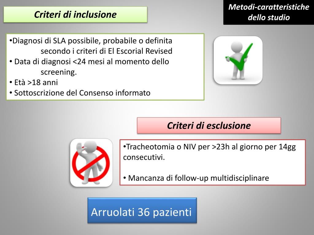 Metodi-caratteristiche dello studio Criteri di inclusione • Diagnosi di SLA possibile, probabile o definita secondo i criteri di ElEscorialRevised • Data di diagnosi <24 mesi al momento dello screening. • Età >18 anni • Sottoscrizione del Consenso informato Criteri di esclusione • Tracheotomia o NIV per >23h al giorno per 14gg consecutivi. • Mancanza di follow-up multidisciplinare Arruolati 36 pazienti