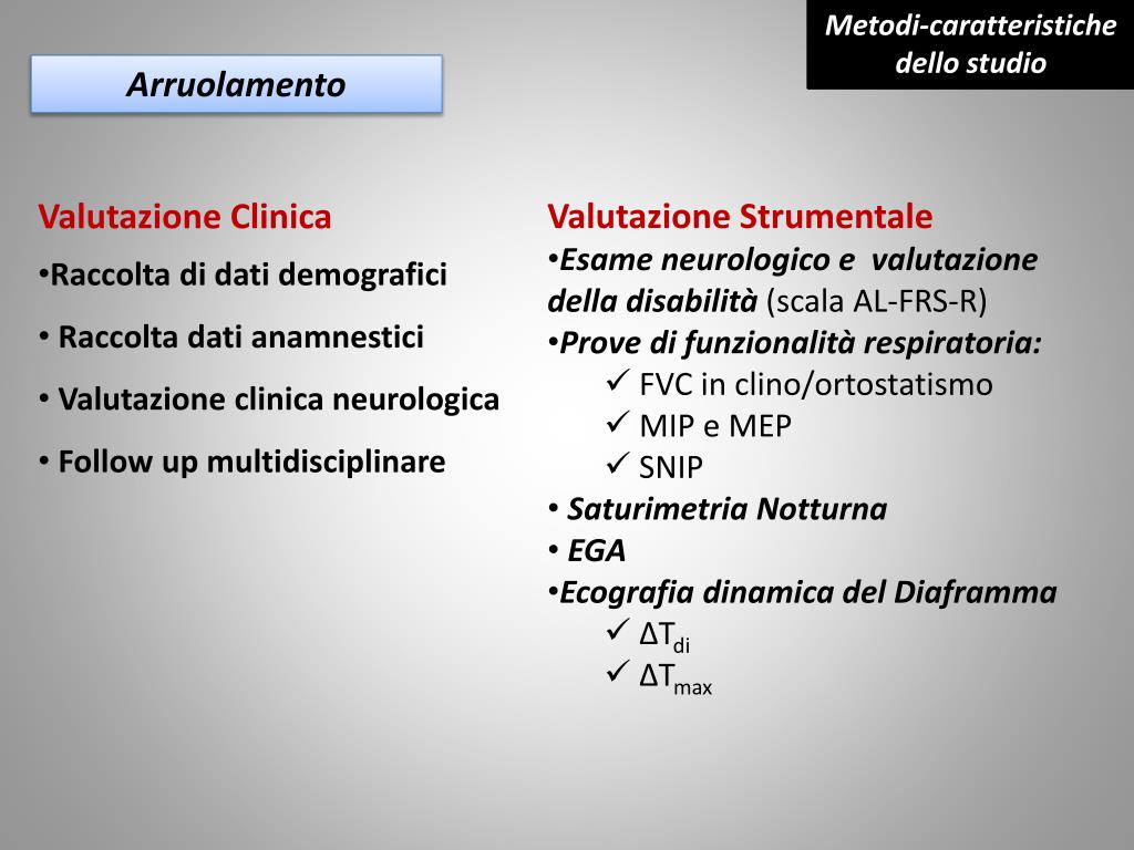 Metodi-caratteristiche dello studio Arruolamento • Valutazione Strumentale • Esame neurologico e valutazione della disabilità (scala AL-FRS-R) • Prove di funzionalità respiratoria: • FVC in clino/ortostatismo • MIP e MEP • SNIP • Saturimetria Notturna • EGA • Ecografia dinamica del Diaframma • ΔTdi • ΔTmax • Valutazione Clinica • Raccolta di dati demografici • Raccolta dati anamnestici • Valutazione clinica neurologica • Follow up multidisciplinare