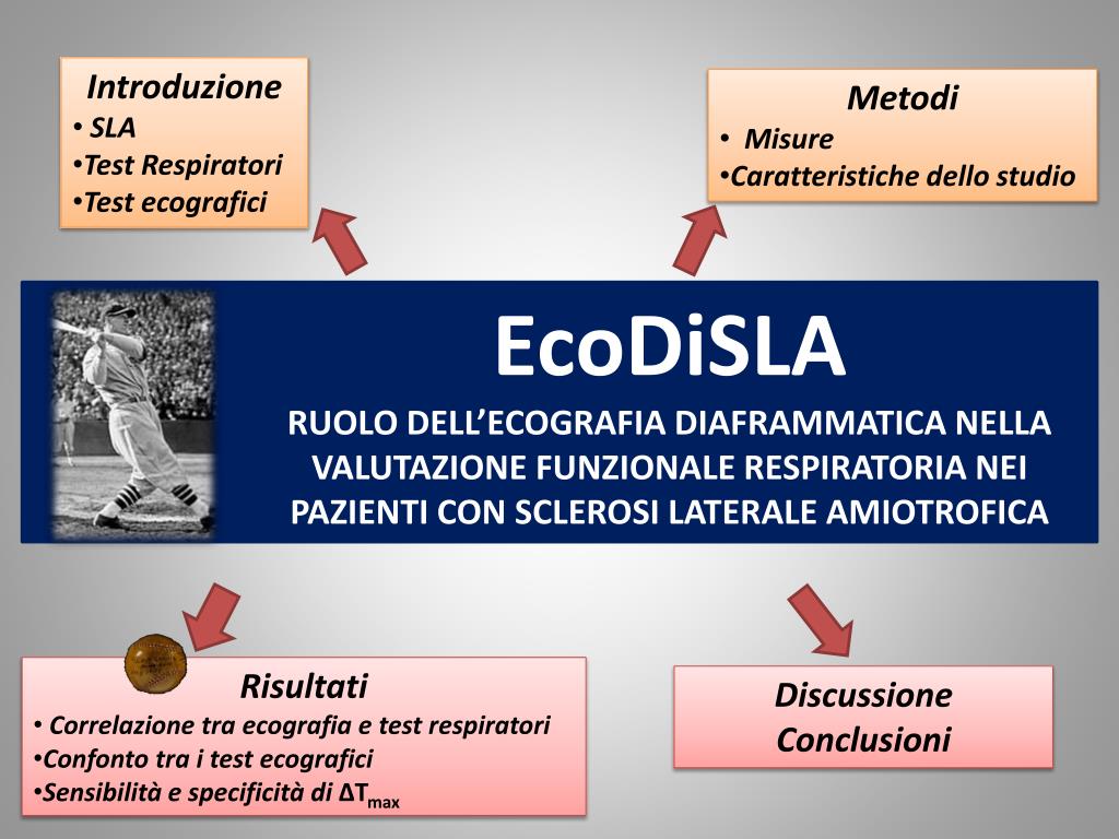 Introduzione • SLA • Test Respiratori • Test ecografici • Metodi • Misure • Caratteristiche dello studio EcoDiSLA RUOLO DELL’ECOGRAFIA DIAFRAMMATICA NELLA VALUTAZIONE FUNZIONALE RESPIRATORIA NEI PAZIENTI CON SCLEROSI LATERALE AMIOTROFICA • Risultati • Correlazione tra ecografia e test respiratori • Confonto tra i test ecografici • Sensibilità e specificità di ΔTmax Discussione Conclusioni