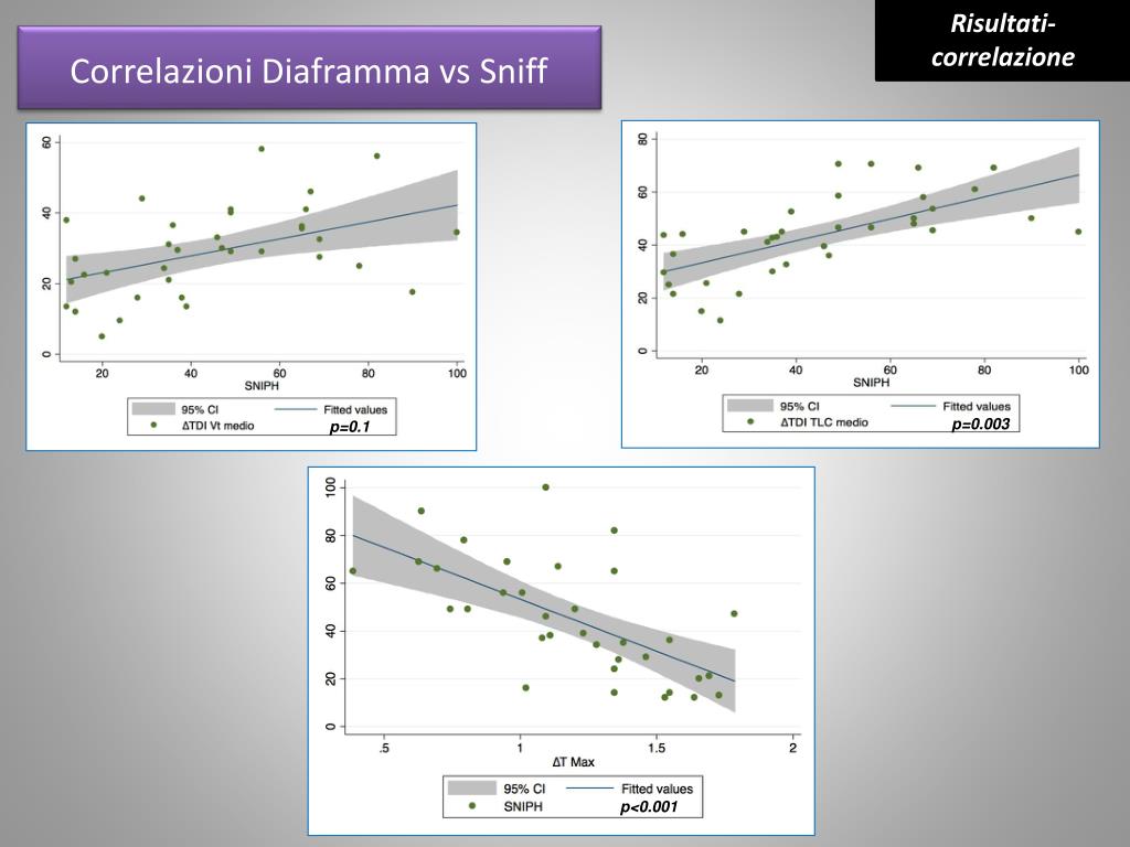 Risultati- correlazione Correlazioni Diaframma vs Sniff p=0.003 p=0.1 p<0.001