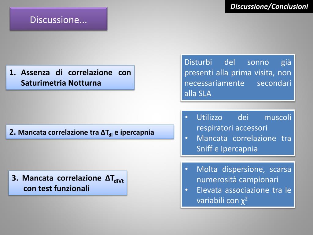 Discussione/Conclusioni Discussione... Disturbi del sonno già presenti alla prima visita, non necessariamente secondari alla SLA Assenza di correlazione con Saturimetria Notturna • Utilizzo dei muscoli respiratori accessori • Mancata correlazione tra Sniff e Ipercapnia 2. Mancata correlazione tra ΔTdi e ipercapnia • Molta dispersione, scarsa numerosità campionari • Elevata associazione tra le variabili con χ2 3. Mancata correlazione ΔTdiVt con test funzionali