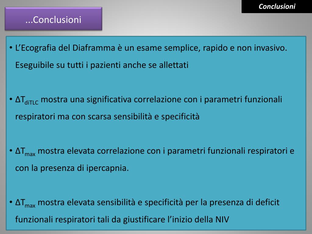 Conclusioni ...Conclusioni • L’Ecografia del Diaframma è un esame semplice, rapido e non invasivo. Eseguibile su tutti i pazienti anche se allettati • ΔTdiTLC mostra una significativa correlazione con i parametri funzionali respiratori ma con scarsa sensibilità e specificità • ΔTmax mostra elevata correlazione con i parametri funzionali respiratori e con la presenza di ipercapnia. • ΔTmax mostra elevata sensibilità e specificità per la presenza di deficit funzionali respiratori tali da giustificare l’inizio della NIV