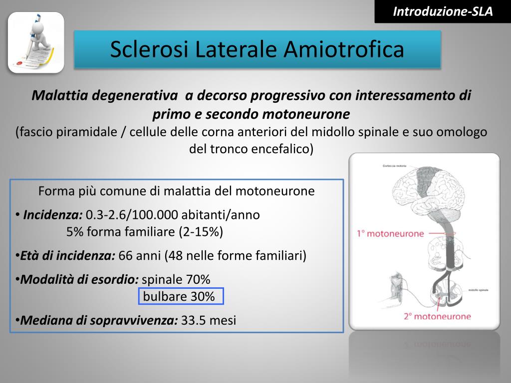Introduzione-SLA Sclerosi Laterale Amiotrofica Malattia degenerativa a decorso progressivo con interessamento di primo e secondo motoneurone (fascio piramidale / cellule delle corna anteriori del midollo spinale e suo omologo del tronco encefalico) • Forma più comune di malattia del motoneurone • Incidenza: 0.3-2.6/100.000 abitanti/anno • 5% forma familiare (2-15%) • Età di incidenza: 66 anni (48 nelle forme familiari) • Modalità di esordio: spinale 70% • bulbare 30% • Mediana di sopravvivenza: 33.5 mesi
