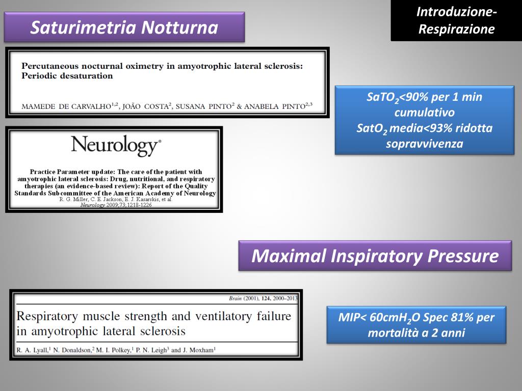 Introduzione-Respirazione Saturimetria Notturna SaTO2<90% per 1 min cumulativo SatO2 media<93% ridotta sopravvivenza Maximal InspiratoryPressure MIP< 60cmH2O Spec 81% per mortalità a 2 anni