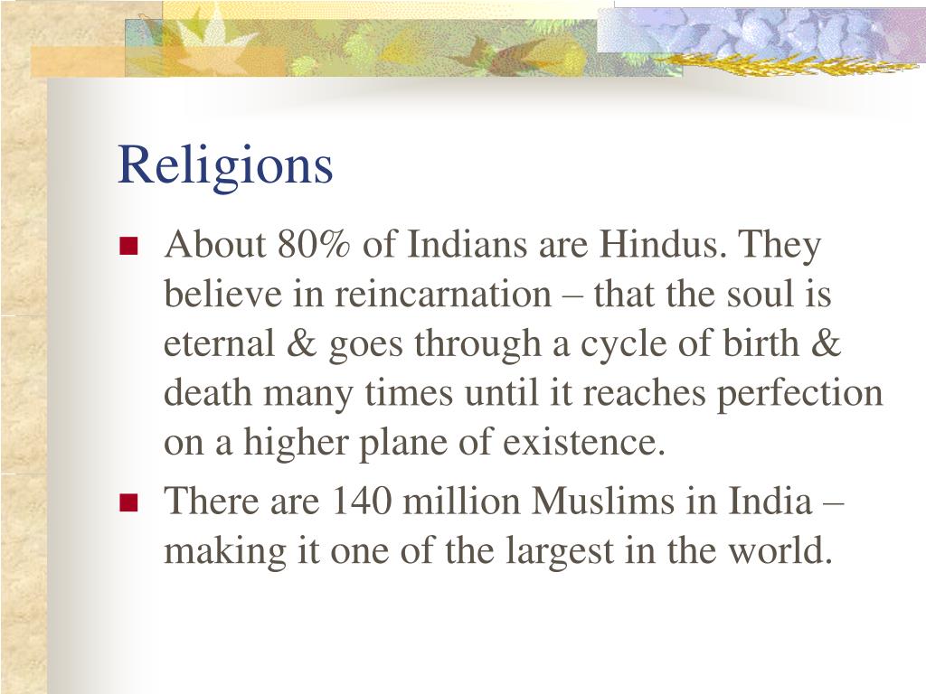 Religions • About 80% of Indians are Hindus. They believe in reincarnation – that the soul is eternal & goes through a cycle of birth & death many times until it reaches perfection on a higher plane of existence. • There are 140 million Muslims in India – making it one of the largest in the world.